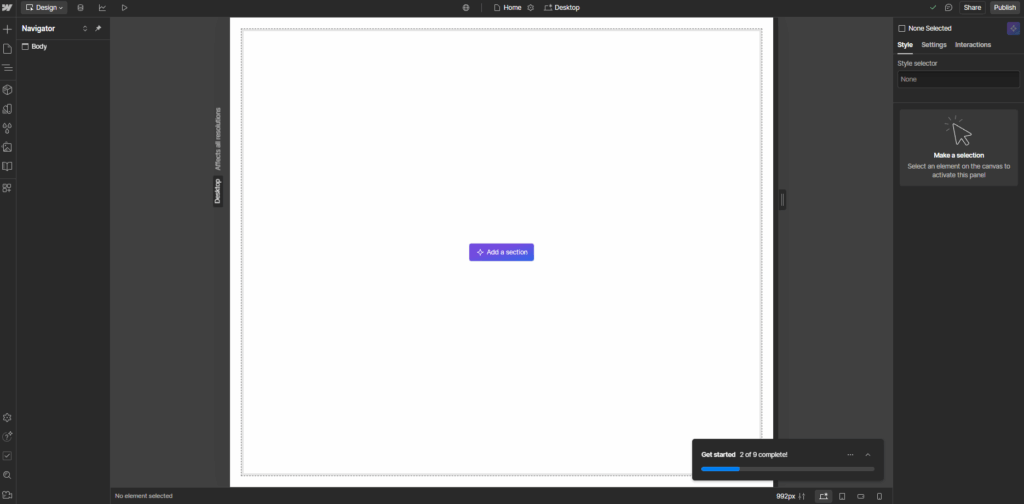 Vamos mostrar como fazer em cada uma das opções, mas antes, contextualizaremos o menu do Webflow: