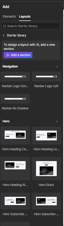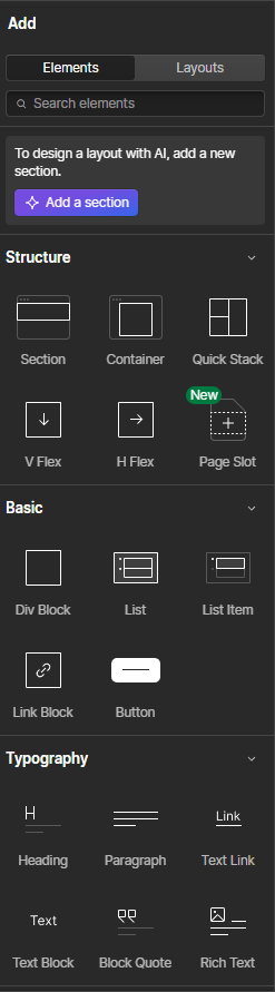 - Elements: blocos básicos (texto, imagem, botões, containers). Esse modo dá mais liberdade e controle, mas exige entender a lógica de estrutura (Section → Container → Div Block → Conteúdo). É o preferido por quem quer personalização total;