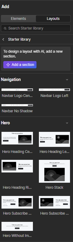 - Layouts: seções prontas que você arrasta para a página (Hero, Footer, Galeria, etc.). É o jeito mais indicado para iniciantes, porque já vem estruturado e você só troca o conteúdo e estiliza;