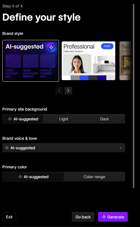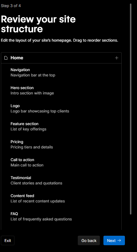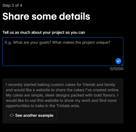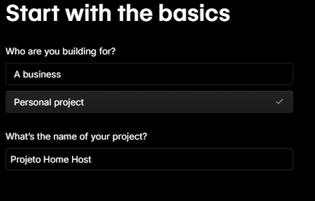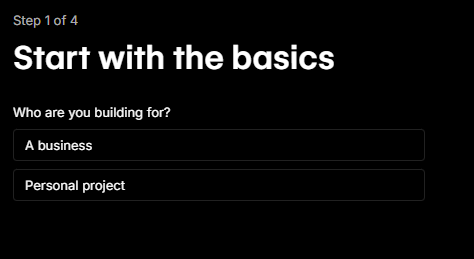 Ao clicar em criar site com IA, é necessário seguir 4 passos antes de começar a buildar seu site:
