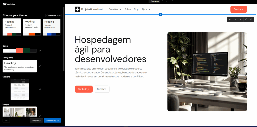 O Webflow usa a lógica de blocos: você organiza seu site em Sections (seções), Containers (que centralizam o conteúdo), Grids ou Flexbox (que controlam a distribuição dos elementos). Dessa forma, você consegue estruturar páginas responsivas apenas arrastando e configurando elementos visuais.