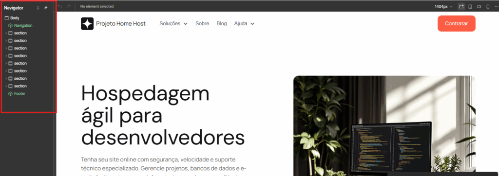 - Navigator: mostra a hierarquia dos elementos da página, útil para organizar e selecionar partes específicas;