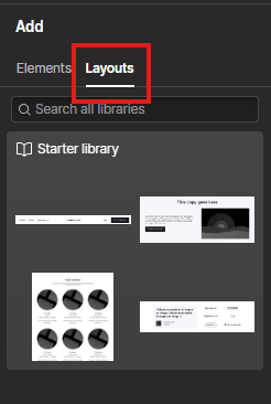 - Add (A): onde você insere elementos básicos (texto, imagens, botões) ou seções prontas (Layouts);