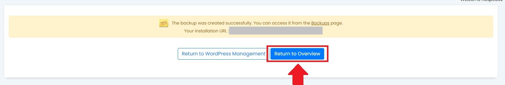 Em seguida, será exibido uma mensagem com a conclusão do seu backup no Softaculous e duas opções. Para voltar ao painel inicial do Softaculous, basta clicar sobre o botão “Return to Overview“.
